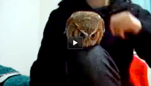Un simpaticissimo gufo si mostra interessato alla telecamera e fa di tutto per guardarla, cercando di superare gli ostacoli che trova.