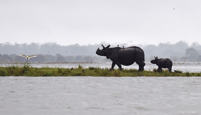 Indian one-horn rhinoceros take shelter from flood waters on higher land at Kaziranga National Park, about 250 kilometres east of Guwahati, on July 10, 2017. / AFP PHOTO / Biju BORO (Photo credit should read BIJU BORO/AFP/Getty Images)